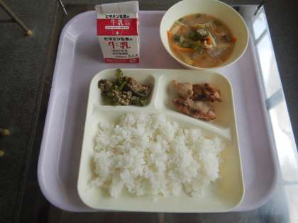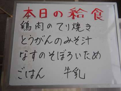 今日の給食は、鶏肉の照り焼き、冬瓜のみそ汁、茄子のそぼろ炒めです。