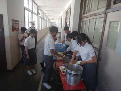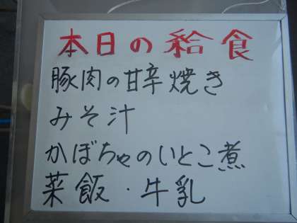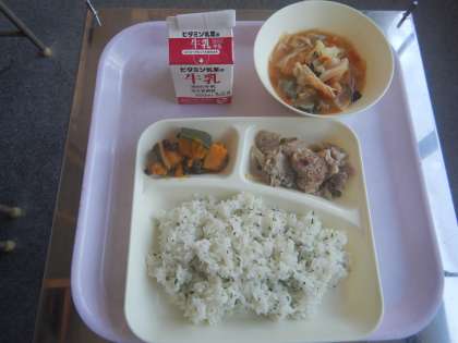 今日の給食は、豚肉の甘辛焼き、みそ汁、かぼちゃのいとこ煮です。ご飯は、菜飯です。