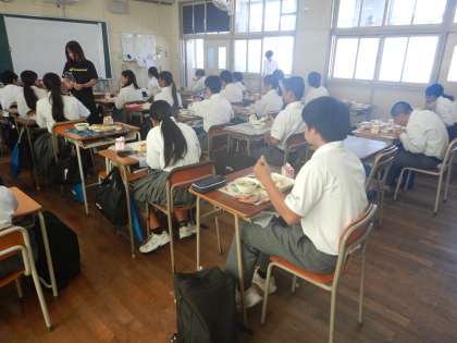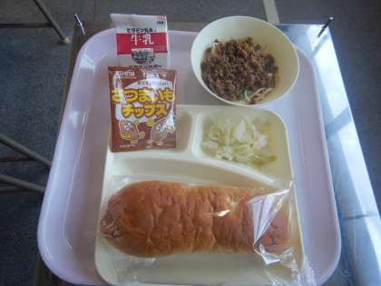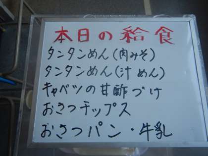 今日の給食は、タンタン麺、キャベツの甘酢つけ、おさつチップスです。パンはおさつパンです。