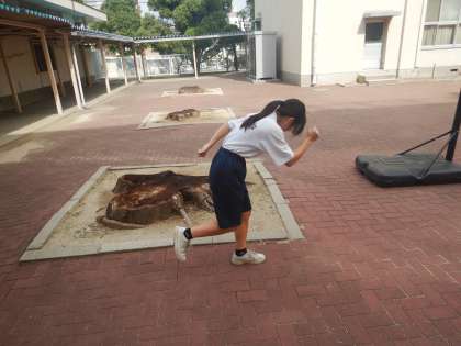 切り株の横で走っているポーズをしている、この人、だ〜れ?