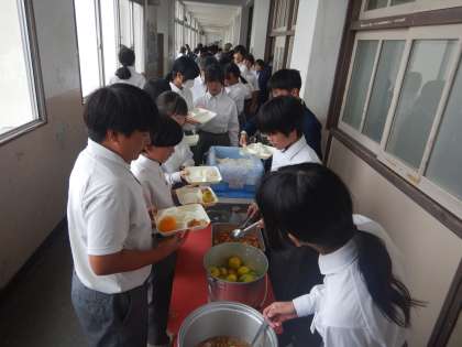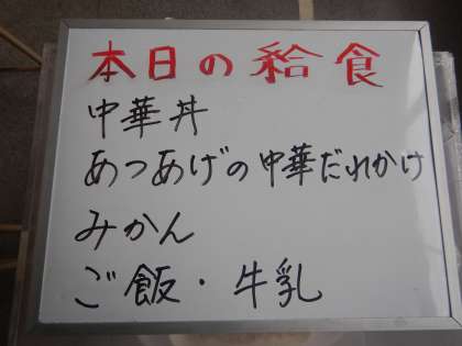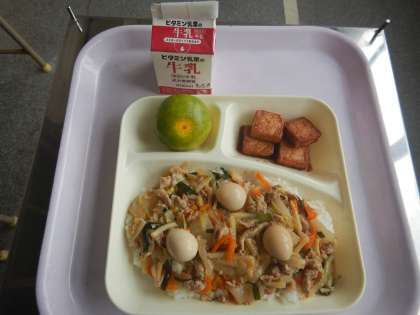 今日の給食は、中華丼、厚揚げの中華だれかけ、みかんです。