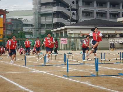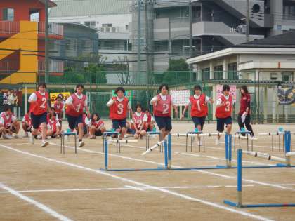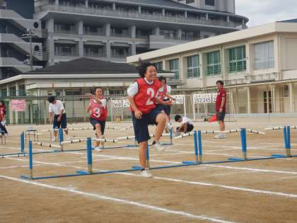 スプーンにピンポン玉を置いて運び、ハードルを跳んで、ネットをくぐります。