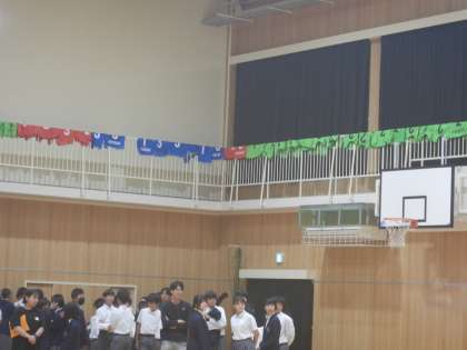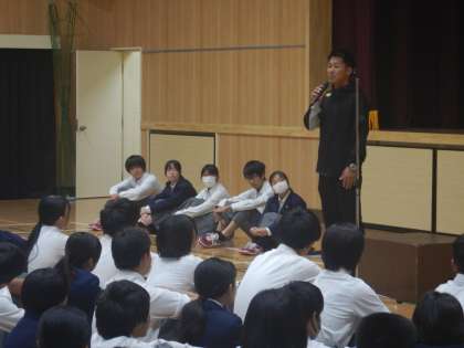 全校集会は、新しい生徒会の司会のもとで行われました。よろしくお願いします。