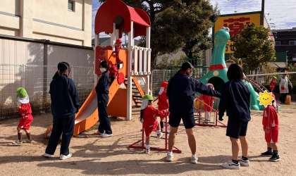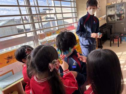 園児と一緒に楽しんでいるようですが、洗濯ばさみのようなもので遊ばれている生徒も。。。。、