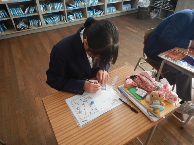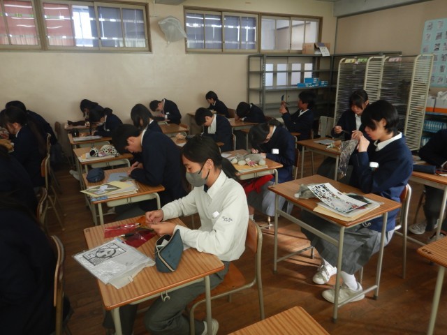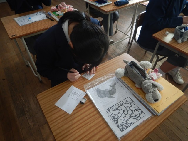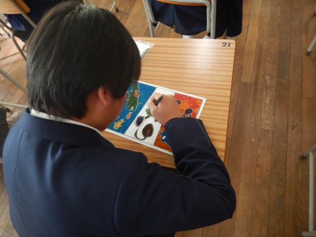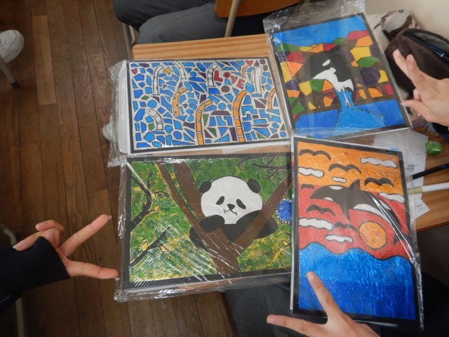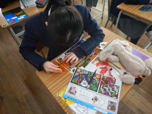2年生の美術の授業では、ステンドグラス風の作品を製作していました。色とりどりの作品が次々とでき上がっていました。