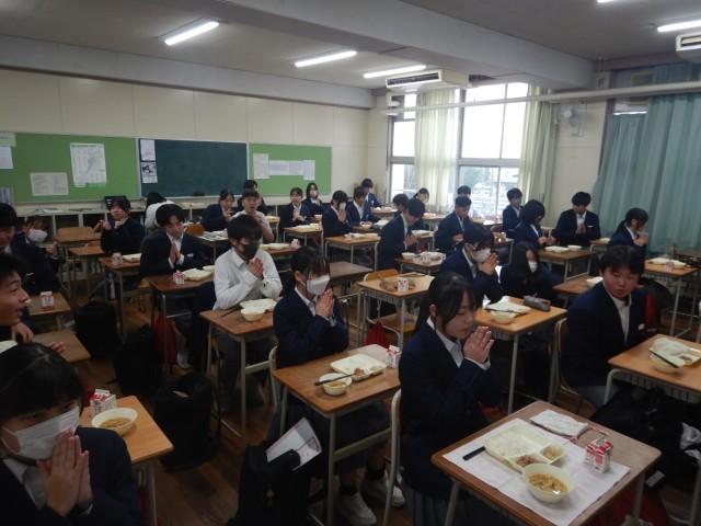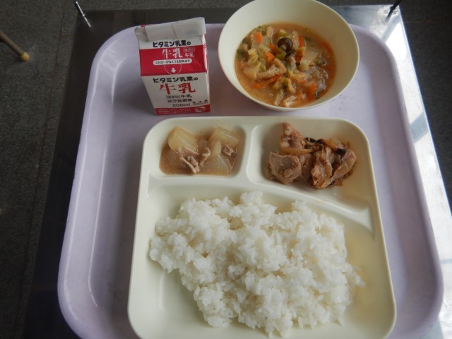 温かいご飯に、やわらかく煮込んだ大根、具だくさんのみそ汁とバランスの取れた給食は、成長段階の生徒の皆さんに大切な栄養素をバランスよく届ける食事です。残さず、好き嫌いせず、食べてくださいね^v^