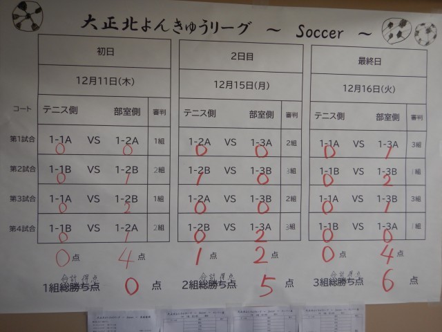 49期生の戦い「よんきゅうリーグサッカー編」が開催され、結果が張られていました。