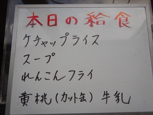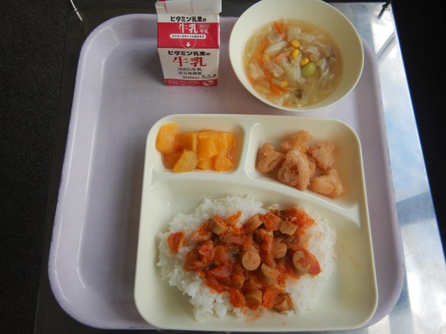 今日の給食は、ケチャップライス、スープ、れんこんフライ、黄桃(カット缶)です。