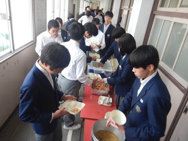 スープには、鶏肉、キャベツ、人参、コーン、しめじ、枝豆と多くの野菜が入っています。また、れんこんフライもついて、風邪の流行るこの時期には、野菜を多く摂って、体の調子を整える献立となっています。よく噛んで、病気に強い体を作りましょう!!