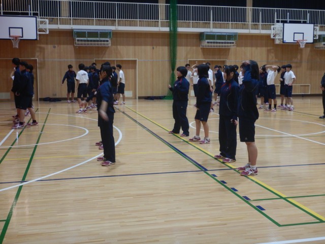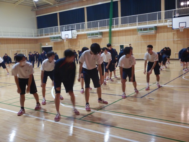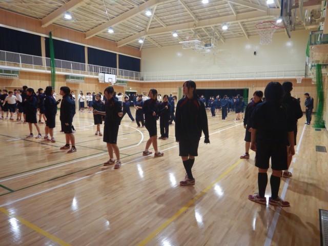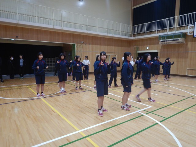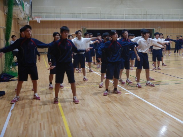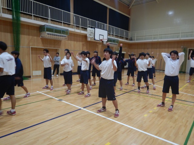 今日は、班ごとに発表ダンスを披露します。まずは、ウォーミングアップ!!