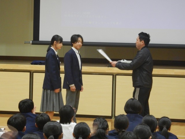 その後、先日行われたスポーツ大会の表彰式を行いました。優勝クラスの代表は、大きな声で喜びを表していました。