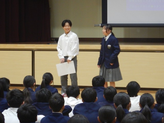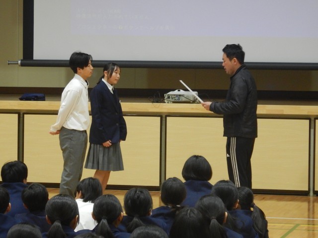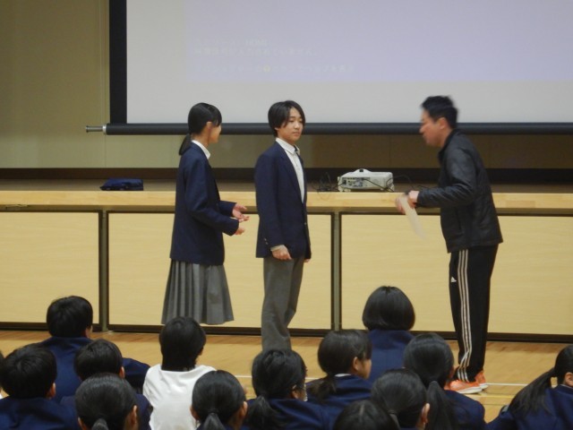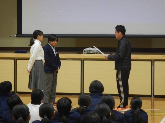 2時間目に体育館で1年生が「冬休み事前指導」を行っていました。