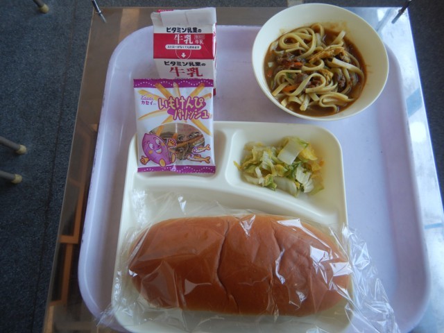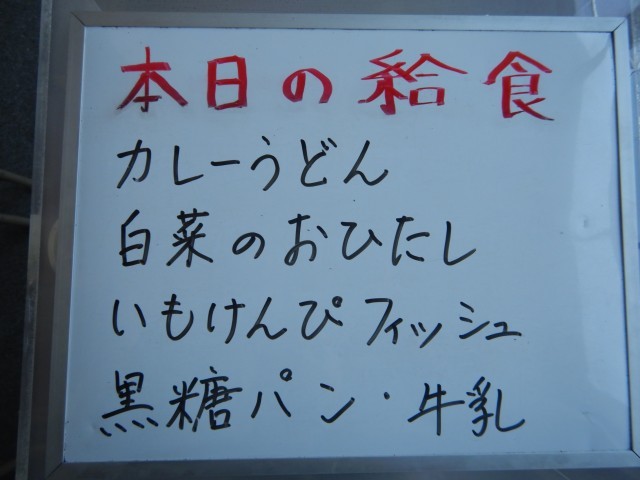 今日の給食は、カレーうどん、白菜のおひたし、芋けんぴフィッシュです。