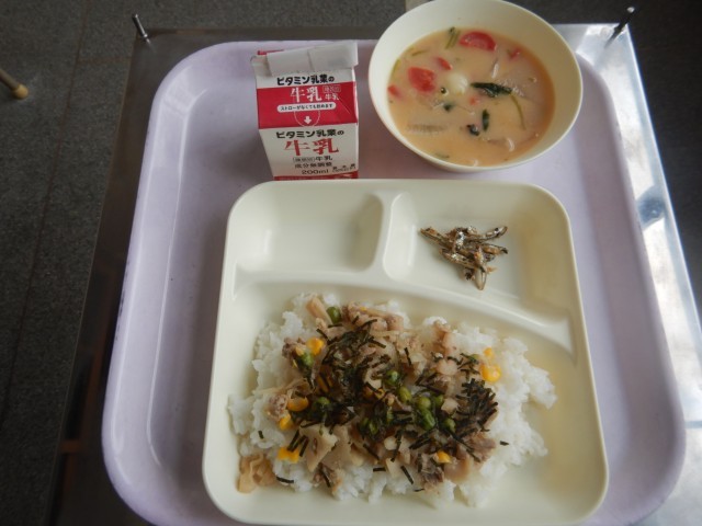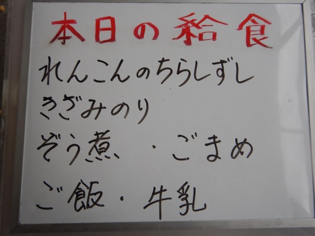 今日の給食は、れんこんのちらし寿司、雑煮、ごまめです。