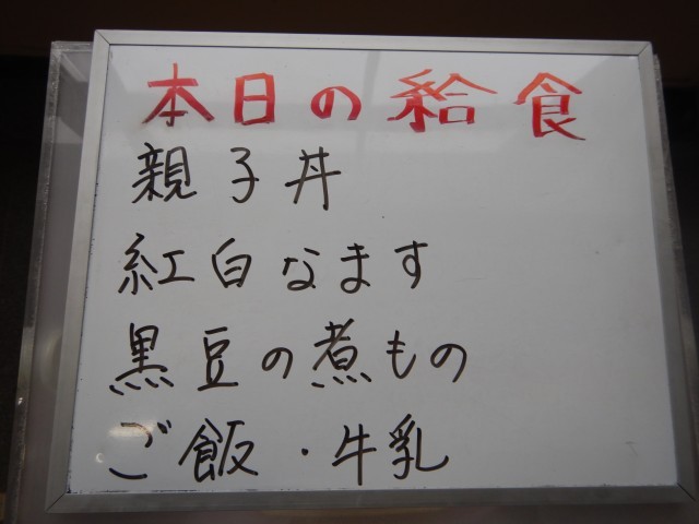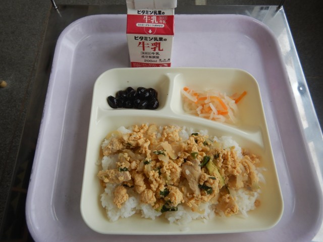 今日の給食は、親子丼、紅白なます、黒豆の煮物です。