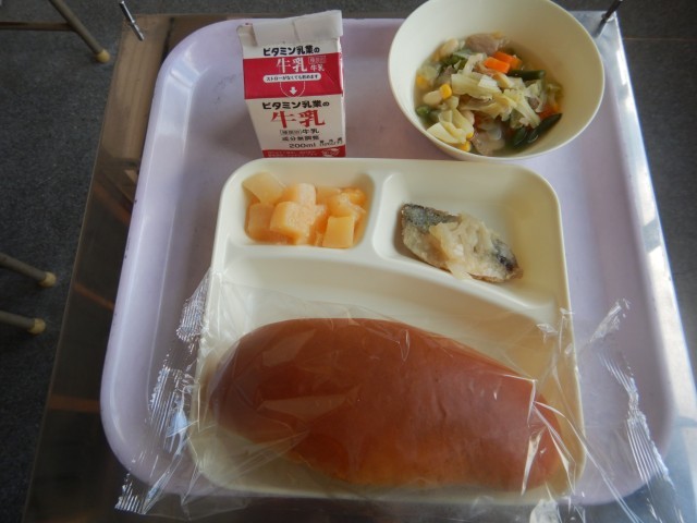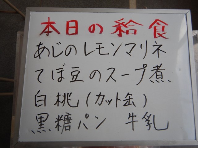 今日の給食は、鯵のレモンマリネ、てぼ豆のスープ煮、白桃(カット缶)です。パンは黒糖パンです。