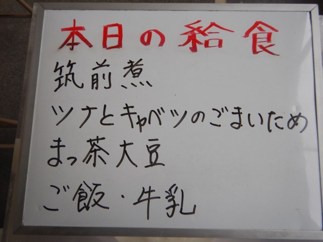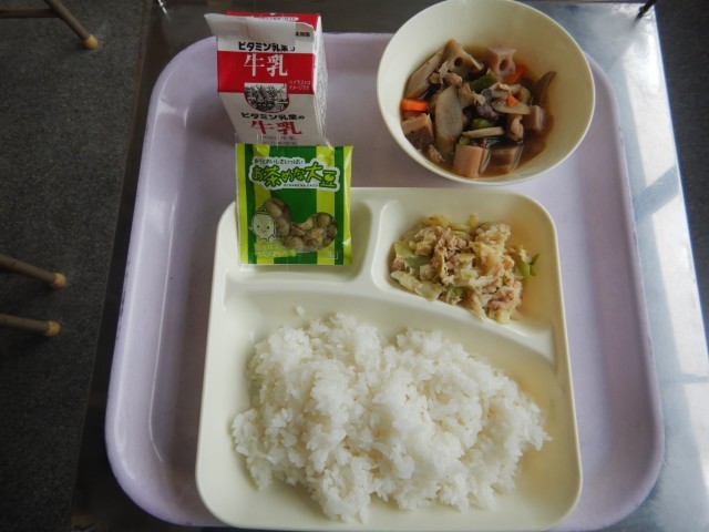 今日の給食は、筑前煮、ツナとキャベツのごま炒め、抹茶大豆です。
