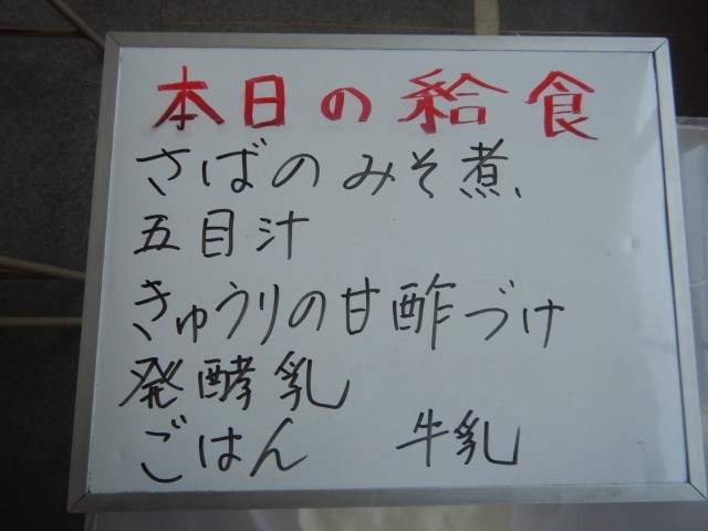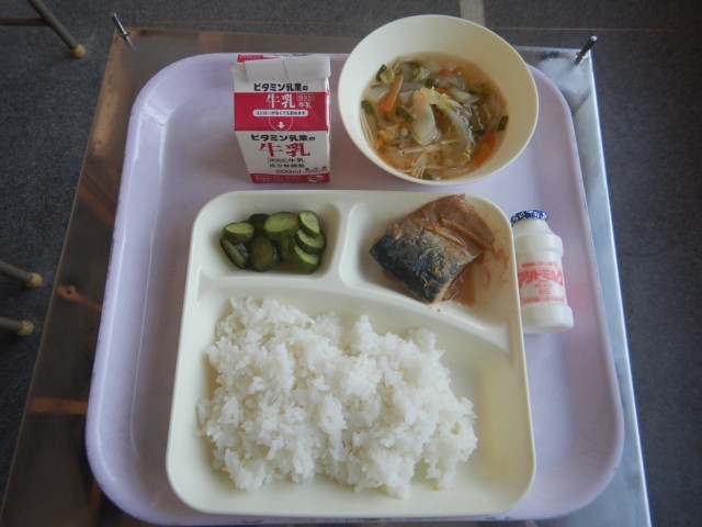 今日の給食は、サバの味噌煮、五目汁、きゅうりの甘酢つけ、発酵乳です。