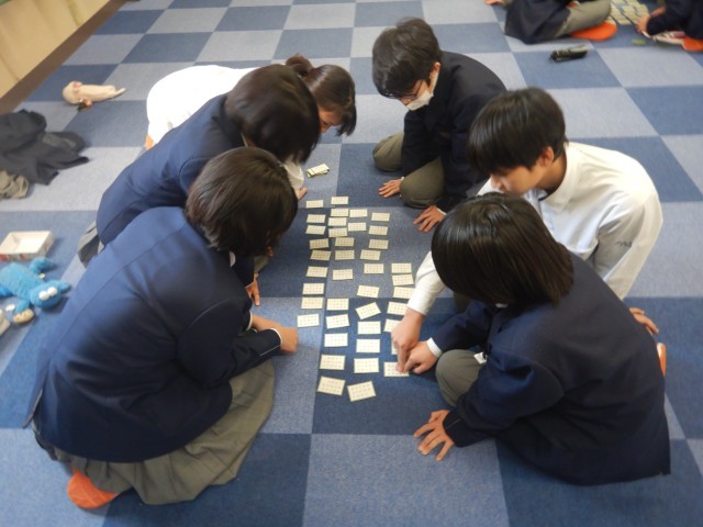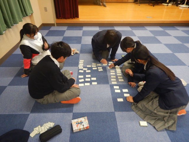 それに向けて、練習をしているところにお邪魔しました。遠慮しながらとっているのか、探すのに時間がかかっているのか。なかなか手が出ません。本番までには、1枚でも多くの札を覚えましょう!