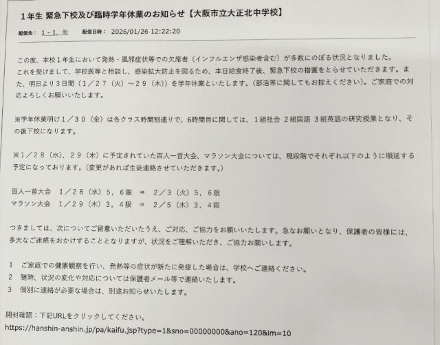 ミマモルメで連絡致しましたが、本日1年生は給食喫食後下校し木曜日まで学年休業となります。