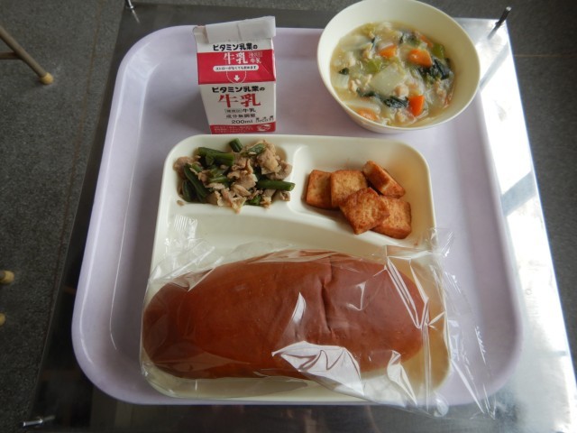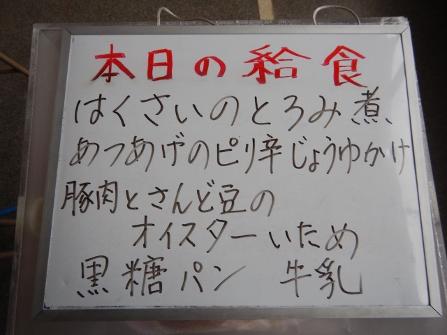 今日の給食は、白菜のとろみ煮、厚揚げのピリ辛醤油かけ、豚肉と三度豆のオイスターソース炒めです。