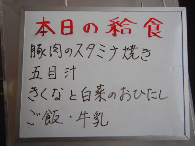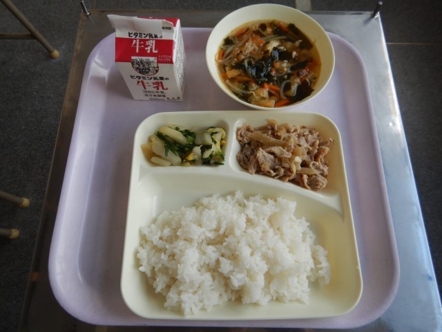 今日の給食は、豚肉のスタミナ焼き、五目汁、菊菜と白菜のおひたしです。