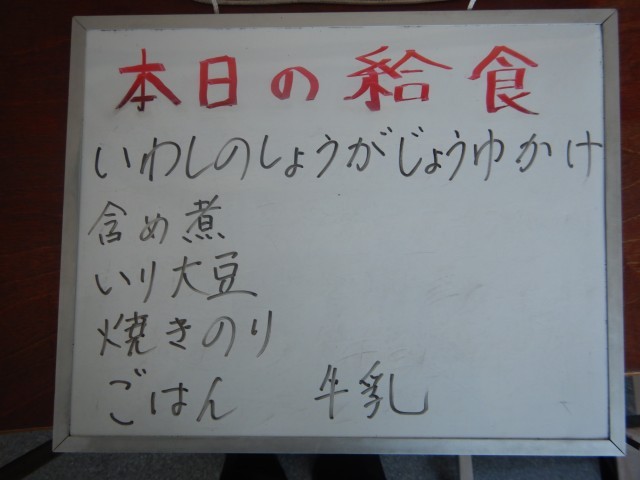今日の給食は、いわしの生姜醤油かけ、含め煮、いり大豆、焼きのりです。
