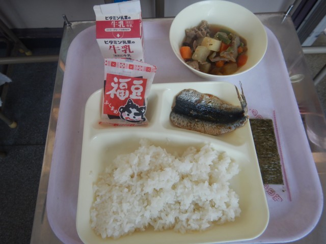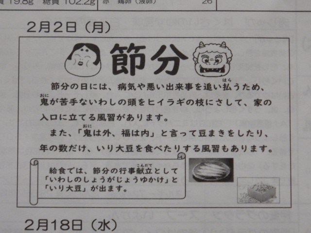 今日の献立は、「節分」がお題です。すこし、イワシの骨と背びれ、尾びれが食べにくかったかもしれませんが、病気や悪い出来事を追い払うため、昔から節分には食べる食材です。しっかり噛んで食べましょう!!
