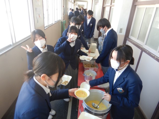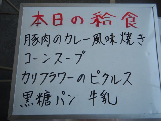 今日の給食は、豚肉のカレー風味焼き、コーンスープ、カリフラワーのピクルスです。パンは黒糖パンです。