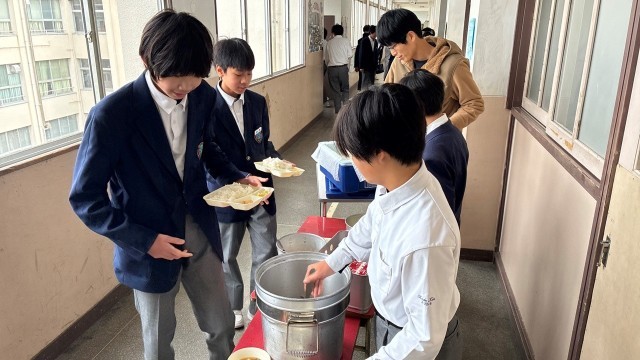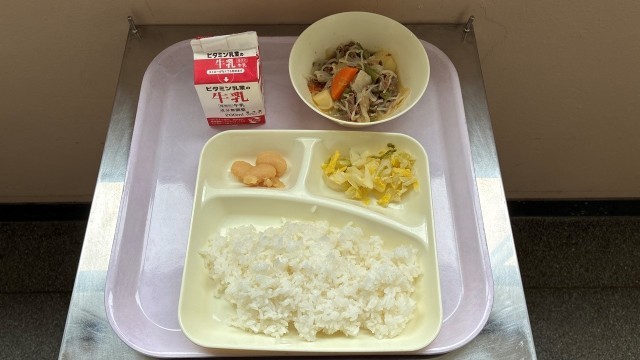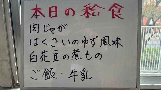 今日の給食は、肉じゃが、白菜のゆず風味、白花豆の煮ものです。