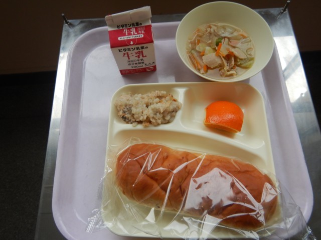 今日の給食は、押し麦のグラタン、スープ、いよかんです。パンはおさつパンです。