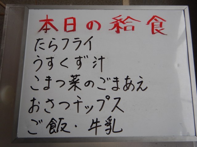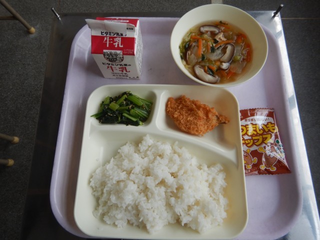 今日の給食は、鱈フライ、うすくず汁、小松菜の胡麻和え、おさつチップスです。