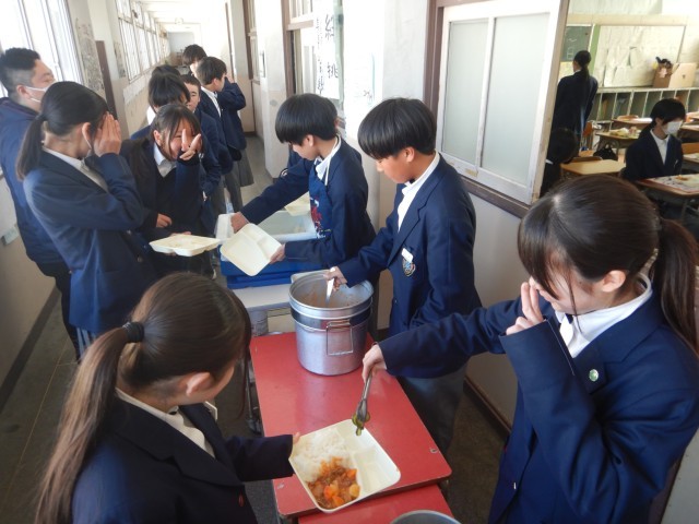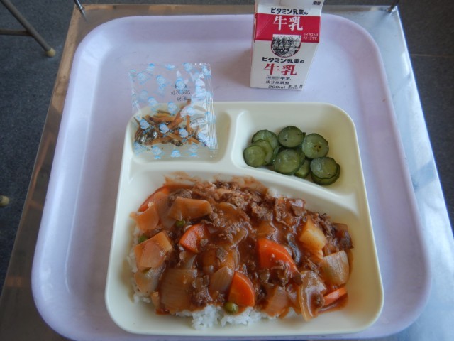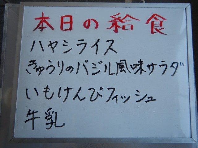 今日の給食は、ハヤシライス、きゅうりのバジル風味サラダ、芋けんぴフィッシュです。