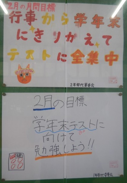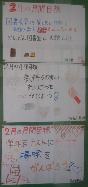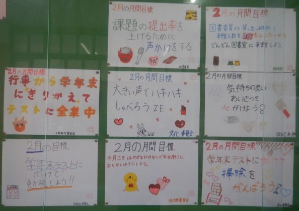 2月は節分があるためか鬼の顔や、バレンタインチョコ、テストの絵が描かれています。保健委員会のひよこもかわいいですね^v^