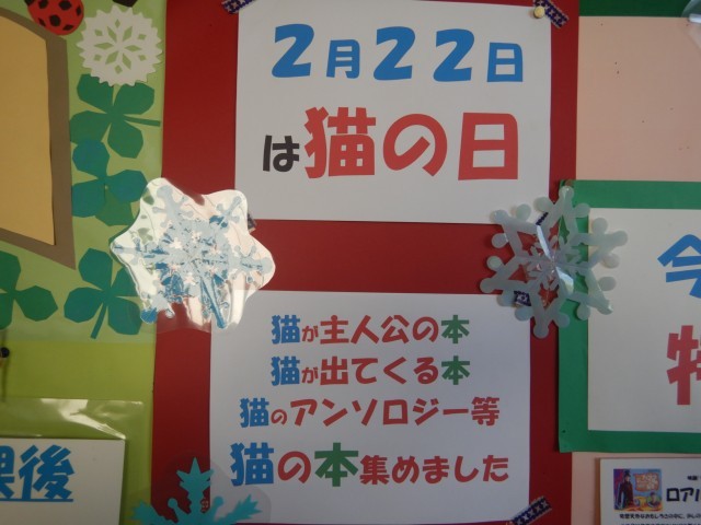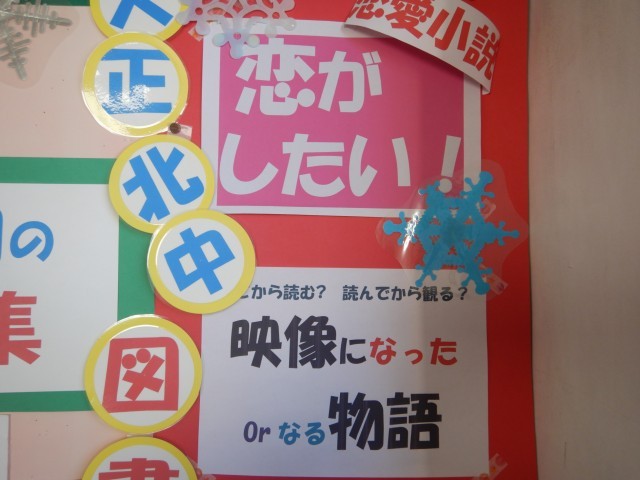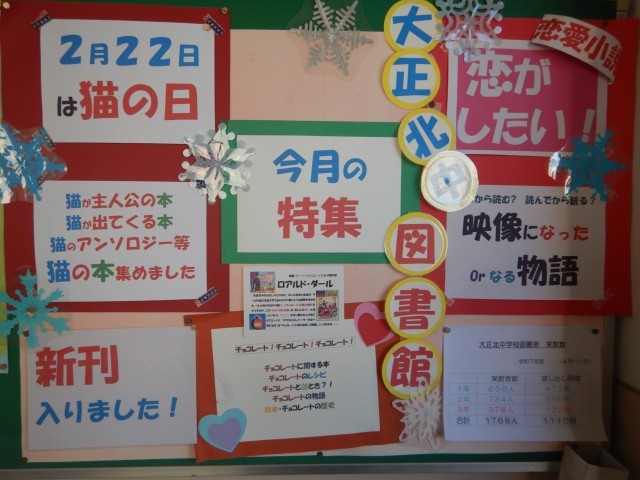 2月に入り、図書室も意匠替えを行いました。節分、バレンタインとイベントもありますので、ちなんだ本が陳列されています。
