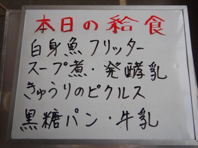 今日の給食は、白身魚フリッター、スープ煮、きゅうりのピクルス、発酵乳です。パンは黒糖パンです。