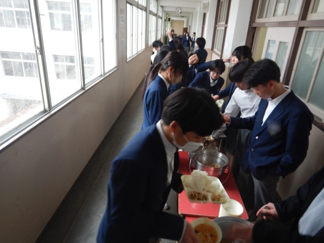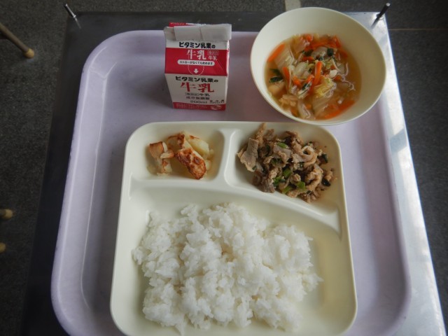 今日の給食は、豚肉と干しずいきの味噌煮、五目汁、焼きじゃがです。