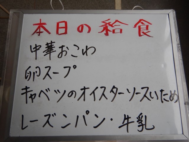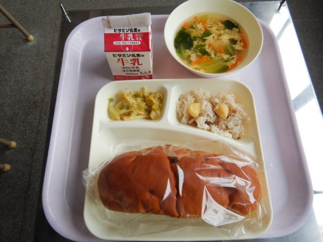 今日の給食は、中華おこわ、卵スープ、キャベツのオイスターソース炒めです。パンは、レーズンパンです。
