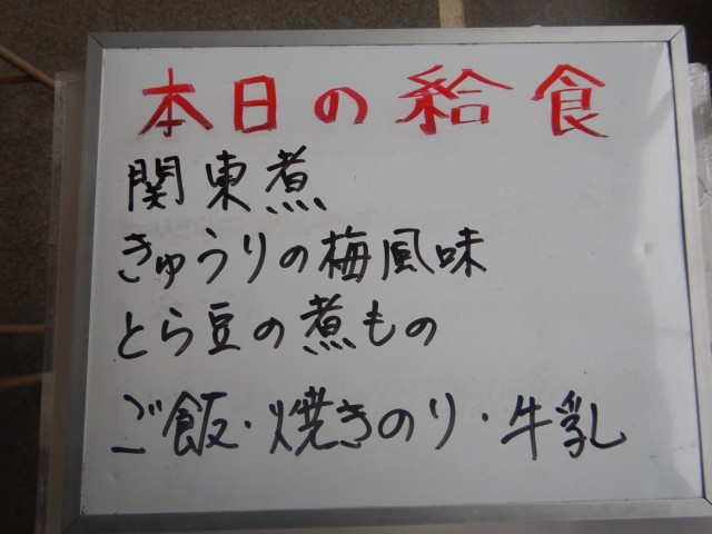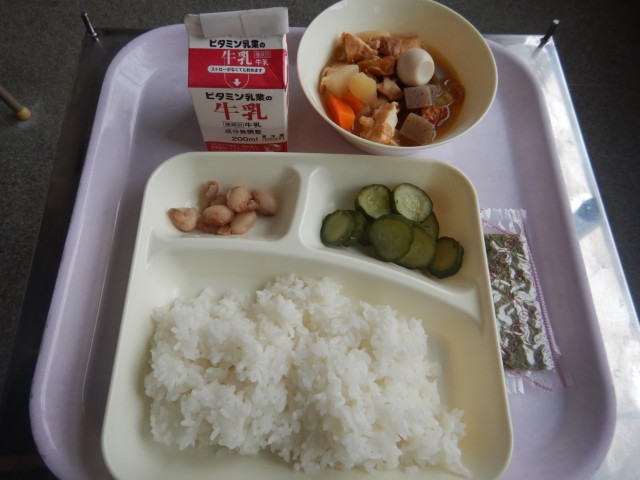 今日の給食は、関東煮、きゅうりの梅風味、とら豆の煮ものです。味付けのりがついています。
