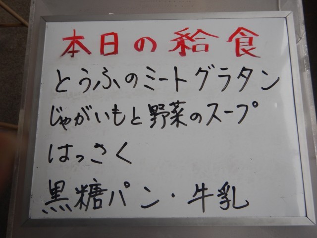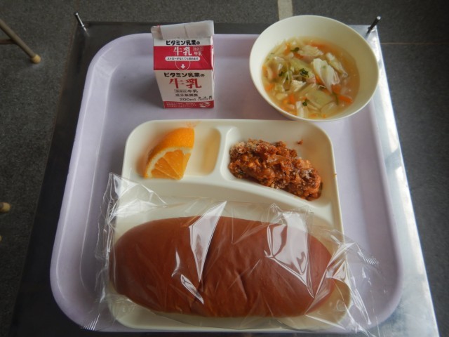今日の給食は、豆腐のミートグラタン、じゃがいもと野菜のスープ、はっさくです。パンは黒糖パンです。