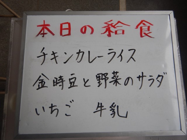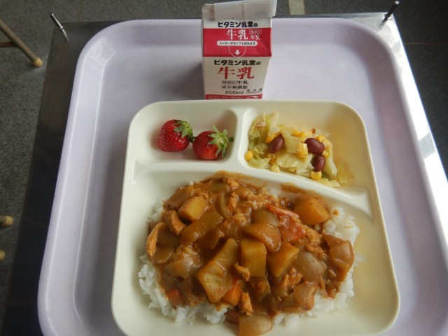 今日の給食は、チキンカレーライス、金時豆と野菜のサラダ、いちごです。