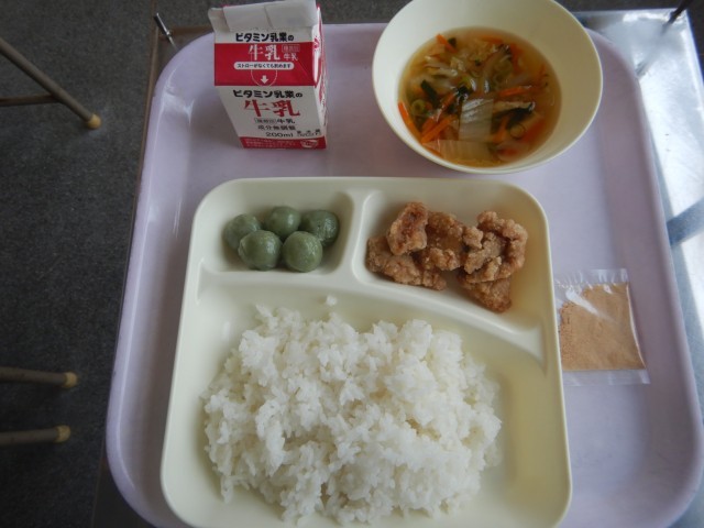 今日の給食は、豚肉の竜田揚げ、五目汁、よもぎ団子です。