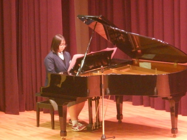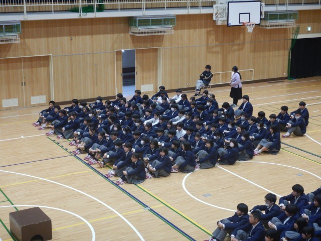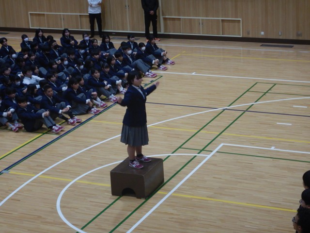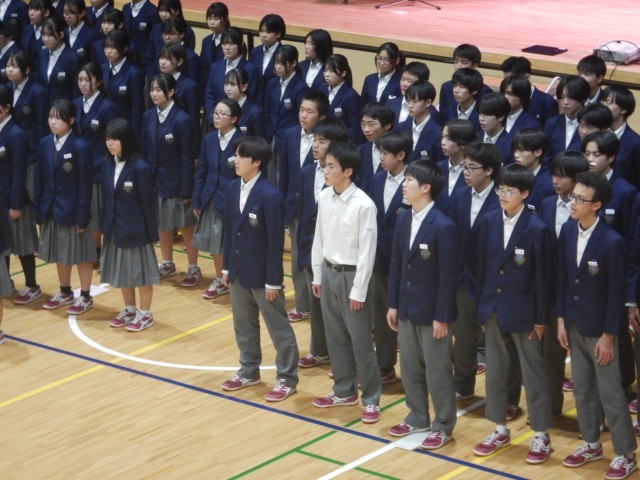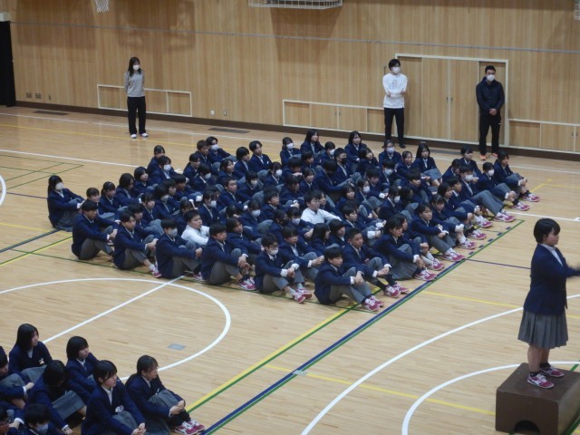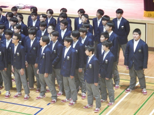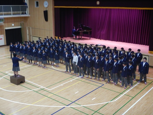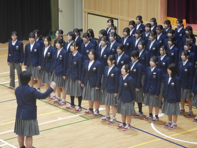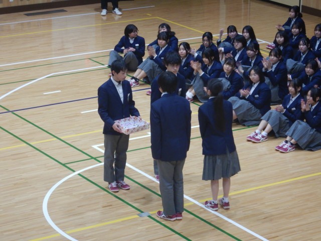 続いて、在校生から卒業記念品の贈呈がありました。卒業生からは、卒業生の歌の合唱が送られました。この曲は、卒業式当日も披露されます。きれいな歌声が体育館に響きました。