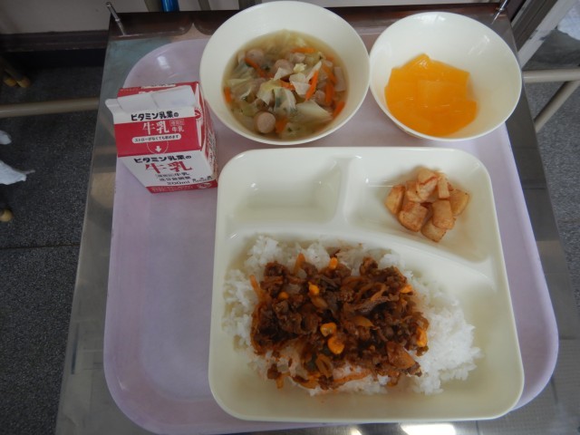 今日の給食は、ビーフケチャップライス、フライドポテト、キャベツのスープ、ダイスゼリー(みかん)です。
