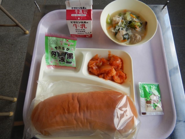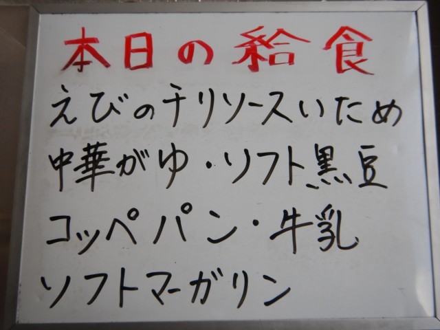 今日の給食は、エビのチリソース炒め、中華がゆ、ソフト黒豆です。パンにはソフトマーガリンがついています。