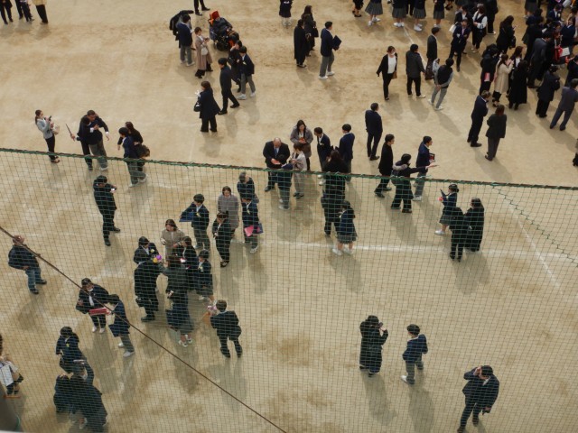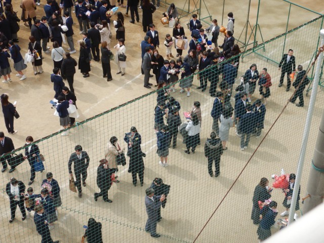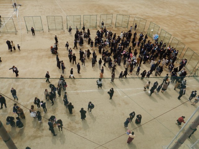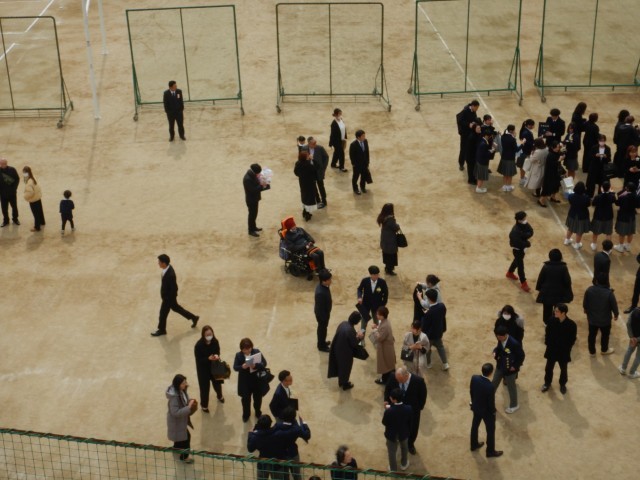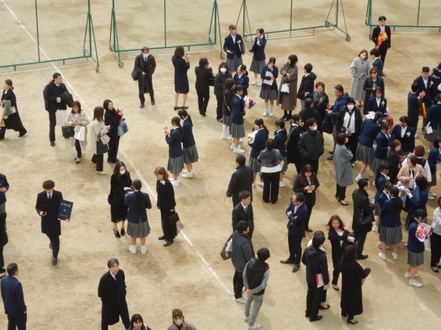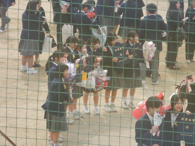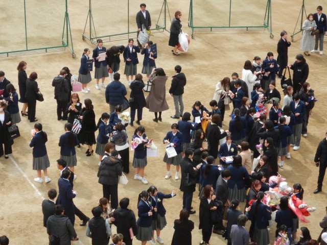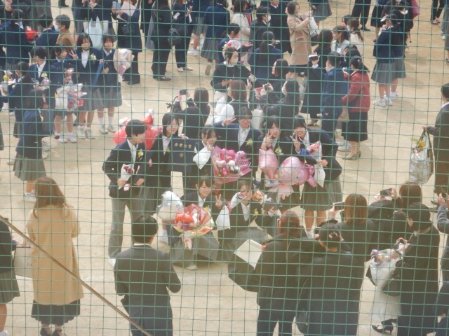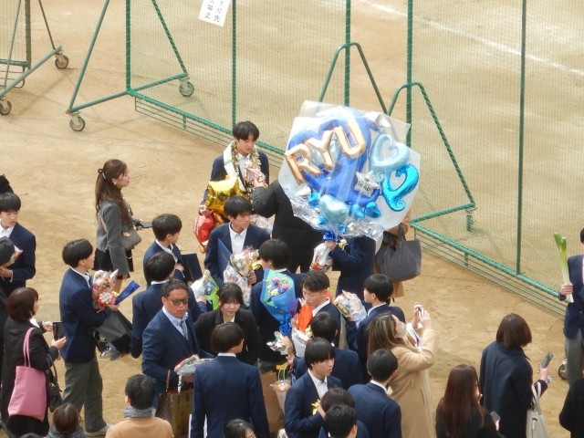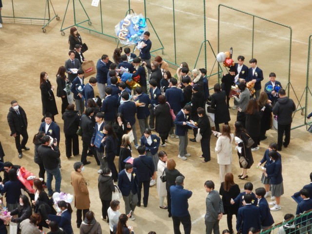 卒業式が終わり、花道を通って卒業生がグラウンドにでてきました。保護者、在校生がいまかいまかと、待っていました。多くの皆さんに囲まれ卒業のお祝いの言葉と、いろいろな送り物をいただいています。