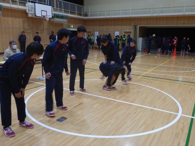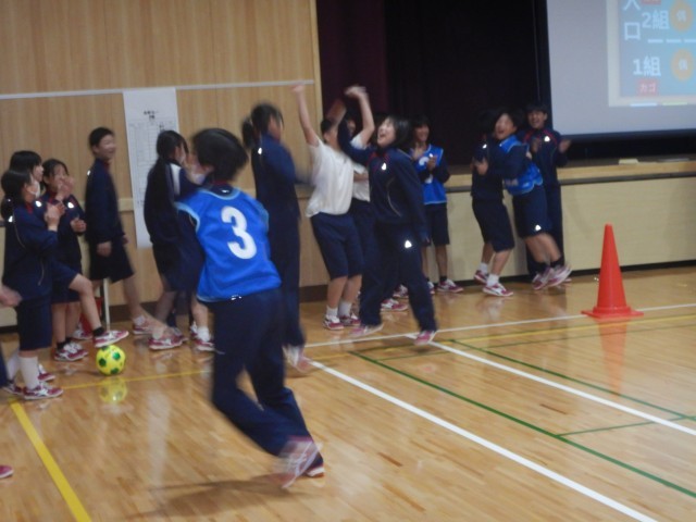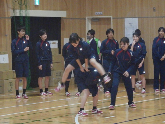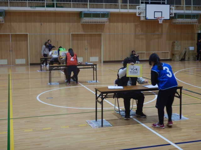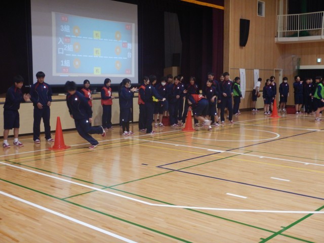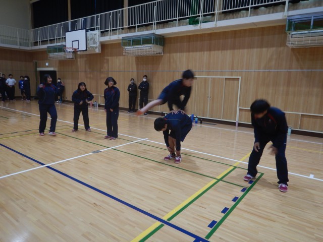 次のゲームは、学級全員リレーです。馬跳びや縄跳び、ピンポン玉運びなど、いろいろなやり方で進むようです。