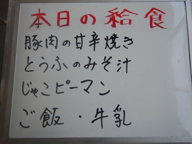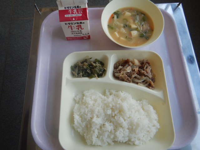 今日の給食は、豚肉の甘辛焼き、豆腐の味噌汁、じゃこピーマンです。