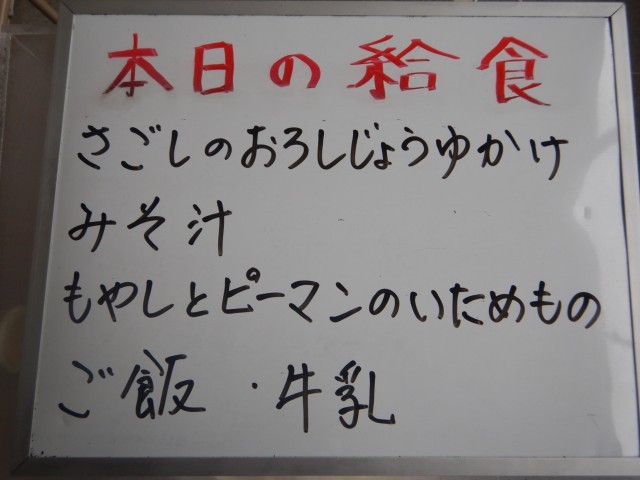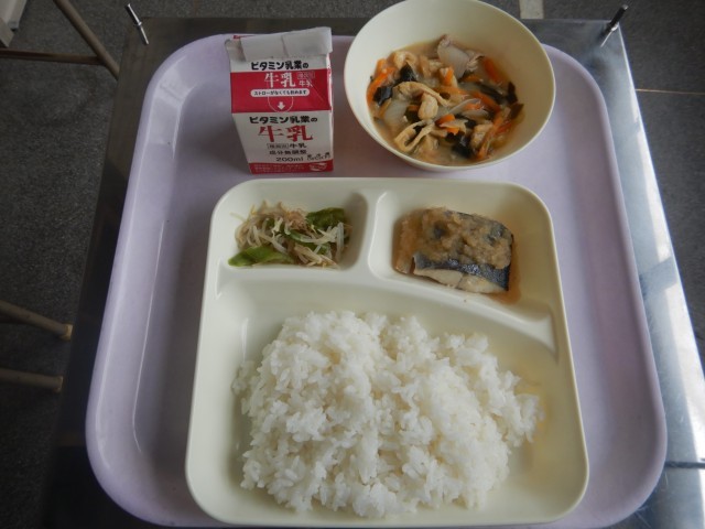 今日の給食は、さごしのおろし醤油かけ、みそ汁、もやしとピーマンの炒め物です。