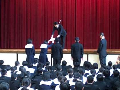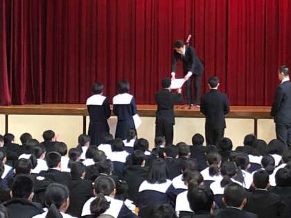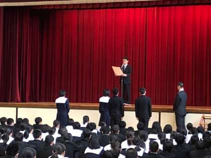 本日の式の中で、春休み行われたバスケットボールの「平成30年度8ブロック1年生大会」の表彰が行われました。男子は優勝、女子は準優勝でした。また、男女共に、優秀選手賞に選ばれた生徒の表彰もありました。よく頑張りました!